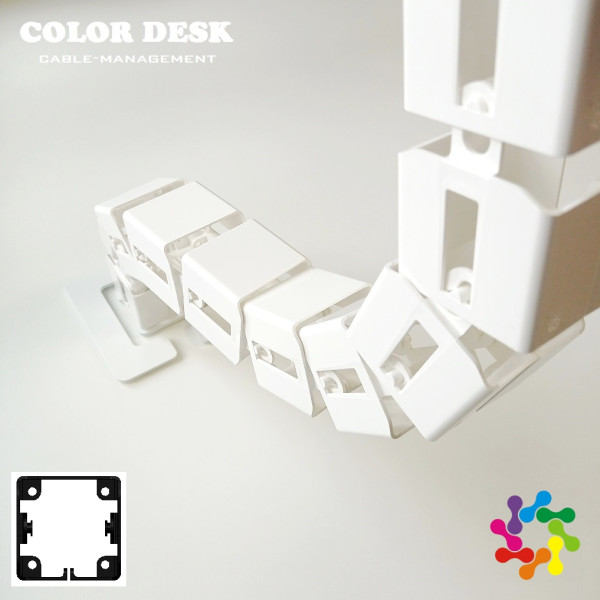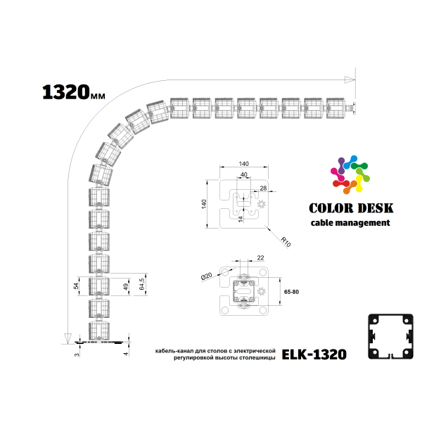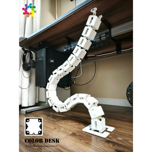 COLOR DESK ELK-1320 это вертикальный гибкий кабель-канал, служащий для организации проводов,идущих от пола к столешнице стола, высота которого постоянно меняется в довольно широком диапазоне. Мы предлагаем своё решение для рабочих мест, оснащённых столами с электрической (или ручной) регулировкой высоты столешницы. Канал для проводов имеет квадратное сечение и состоит из 20 звеньев.
